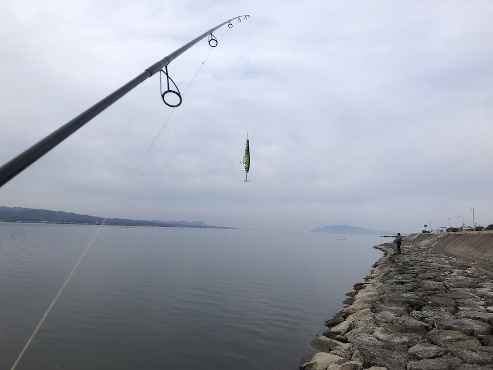 I was planning to go to Saruwatari in Nonami this morning for the yellowtail amberjack (although I knew it was too early for the fish), but my mother suffered a attack of angina pectoris in the early morning, so I had to cancel my plans and take her to her primary practitioner. Fortunately the attack was mild and she was OK. Although I had cancelled my plans, an urge to throw lures toward the vast water lingered in me. So I went to the shore of Lake Shinji to throw lures (although I knew it was too early for the Japanese sea bass). To my surprise, there was a lure fisherman on the shore. I talked to him and found he was just like me. He knew well there was no fish around but, nevertheless, enjoyed throwing lures. He said, “This is also fishing.” I completely agreed with him.